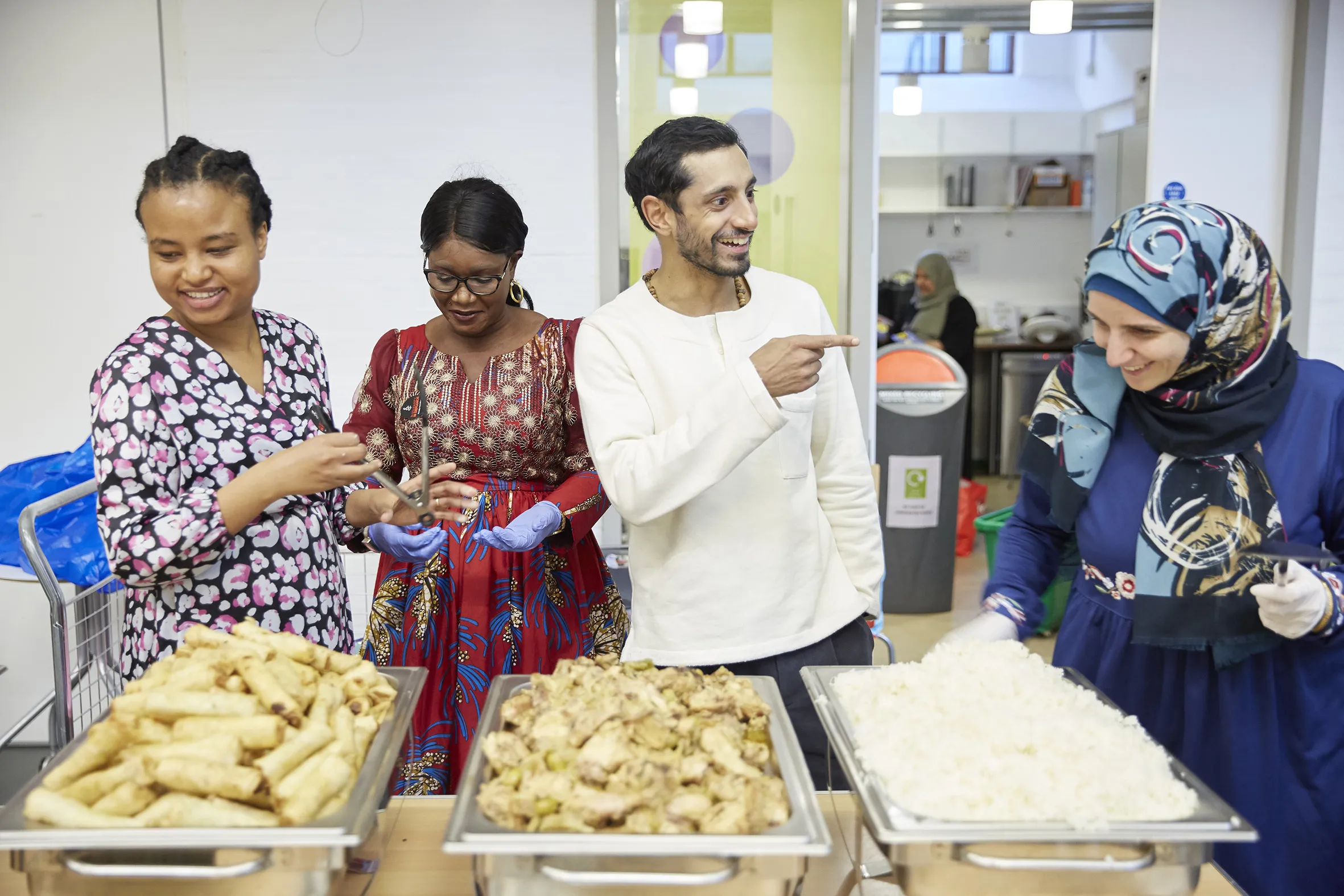 Among the nationalities represented are Afghans, Iranians, Eritreans, Ethiopians, Jamaicans, Nigerians, Pakistanis, Ivorians – all refugees, asylum seekers or migrants – as well as a fair few locals. ‘We noticed that once refugees get here they become isolated,’ says Ahmed. ‘The PTSD and trauma kicks in because their adrenaline rush goes down. So we wanted this to be an evening for people to get to know each other.’ For most, the food is a slice of home comfort. There’s mouthwatering hamli, a sautéed spinach dish from Eritrea; yassa, a spicy chicken stew from Senegal; and crispy sambusa pastries from Syria. At the end of the buffet is a salver of baba ganoush big enough to have its own shipping lanes.
