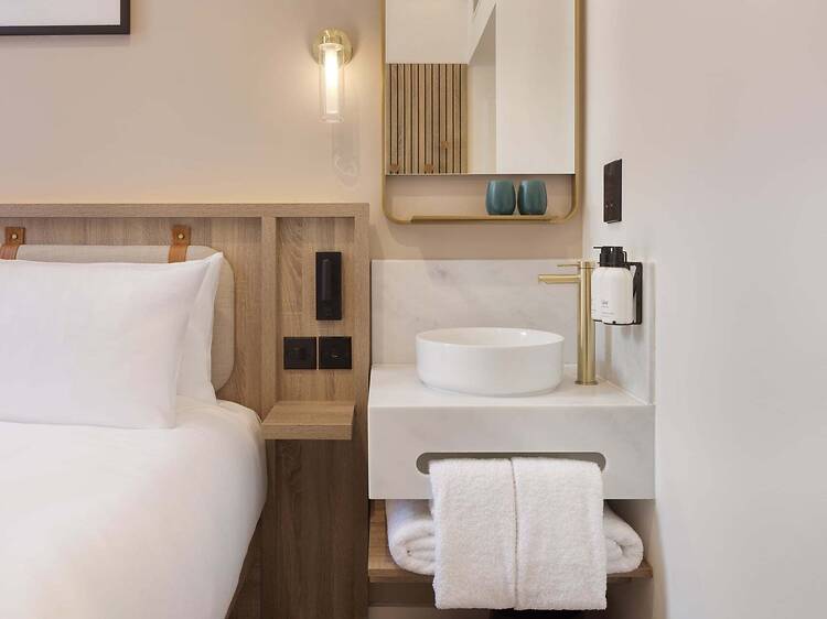 On the design front, everything’s modern, airy, and light, thanks to the wooden bedframe, light hardwood flooring, Carrera marble sinks (the chic kind), built-in lights, actually blackout brushed cotton curtains. There’s no bath, only a shower and a toilet in a compact bathroom separated by a sliding divider, but they’re nice and modern and do the job. The beds are plush, the pillows soft, and the bed spacious. One quite cute feature is that your snug room is tucked away from the main hotel walkway in its own little corridor. You share the corridor with another snug room, which is a good opportunity to make friends with your neighbour by asking to borrow their toothpaste (like I did).
