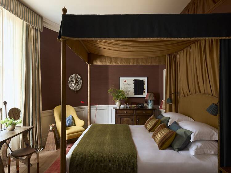 Rooms range from cosy, through superior and deluxe, and there are eight suites. We stay in a junior suite on the first floor, which has super high ceilings, a freestanding bath, three curved bay windows which look out onto the garden and the back of the British Museum, and a grand, four poster bed that’s certainly big enough for any Bloomsbury Group-inspired romantic assignations. The room’s modern design pays tribute to those Arts and Crafts-adjacent creatives of the early 20th century, but doesn’t make you feel like you’re tucked away in an elderly relative’s spare room. Fabric wallpaper is in a comforting shade of rust, there are global nick-nacks inspired by the British Museum’s bounty and weighty drapes across the huge windows. There are Verden toiletries in the bathroom which comes complete with a walk-in shower, a coffee machine, mini bar, kettle and television, as well as a small desk in case you need to dash off a Virginia Woolf-inspired short story and lots of lamps.
