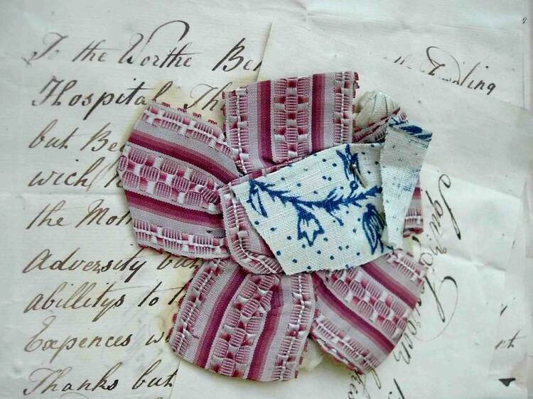 Few of the newborns left anonymously at the Foundling Hospital in the mid-eighteenth century were in possession of such luxuries as blankets, bibs, caps or cloths. Instead, many of the children were accompanied by a piece of fabric that was pinned to their registration form, intended as a means of identification should the mother’s circumstances change.