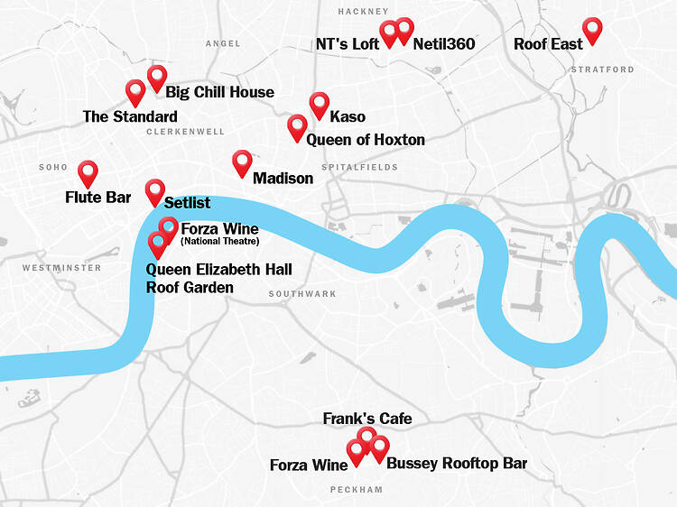 From the map, you can see that there are several clusters of excellent rooftop establishments across the Big Smoke. Down south you’ve got Frank’s, Forza Wine and Bussey Rooftop Bar; on the South Bank is the other Forza Wine at the National Theatre and the aforementioned top spot Queen Elizabeth Hall Roof Garden, while just over the river is Setlist at Somerset House.