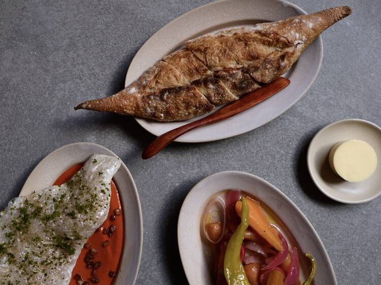All manner of sharing plates are on offer, with an emphasis on open fire grilling. I feel a frisson of joy when our bread and butter arrives in an extremely whimsical fashion. The crisp, warm-in-the-middle loaf has perfectly pointed ends, resembling something from a fairy feast. Equally gorgeous is sea bream crudo, bite-size morsels of fish in a zingy mandarin dressing. Then cheese doughnuts: stuffed with smokey cheddar and drizzled in hot honey. Pure gooey indulgence.