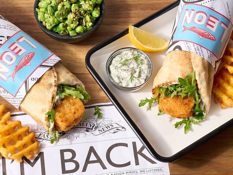 It's all part of the brand's original founder John Vincent's mission to bring Leon back to its roots, after a difficult few months that involved closing 22 branches nationwide. And that means a triumphant return for the dishes it launched with in 2004, including the brand's fish finger butty, which pairs a baked, breadcrumbed sustainable cod fillet with rocket, tartare sauce, and a healthy wrap.