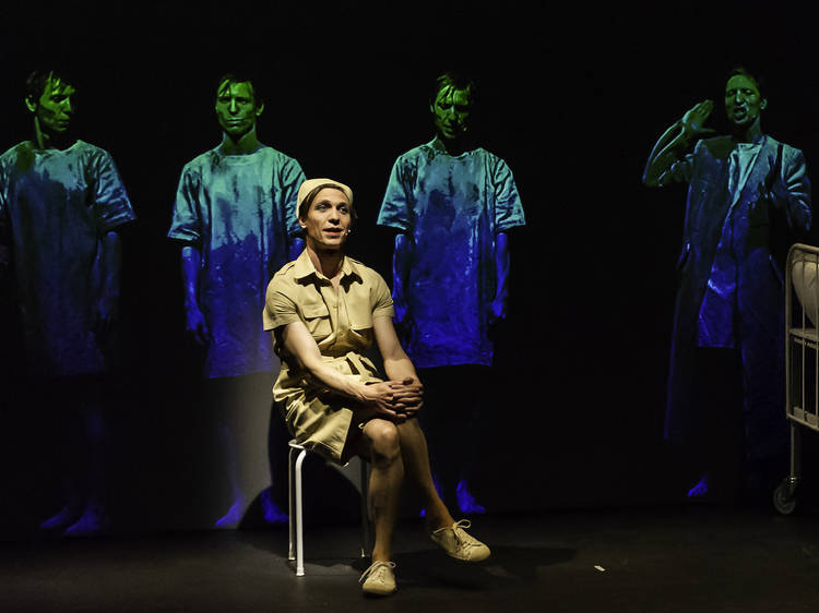 Timed to mark the hundredth anniversary of the First World War, the piece draws on the testimony of those who worked with the dead, the dying and the shellshocked in that conflict and others to weave a woozy, crepuscular and dread-filled piece of experimental theatre. The only live actor on stage is a dragged up Dhaenens, in the narratorial role of a WWI nurse.