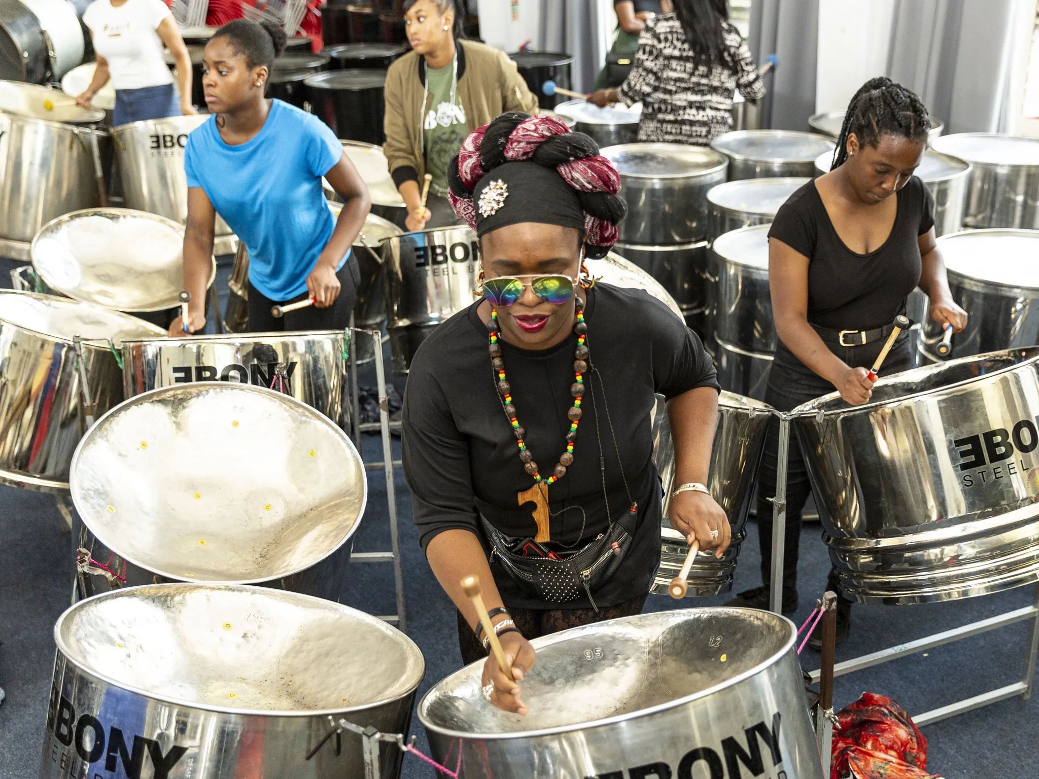 The band is holed up in St Charles Sixth Form College on Ladbroke Grove to prepare for Carnival. Today it’s hot and sweaty, full of the smiles of the 30 band members. The silver skins of their concave steel pans reflect the sunshine coming in through the school’s windows, lending a carnivalesque energy to the space.