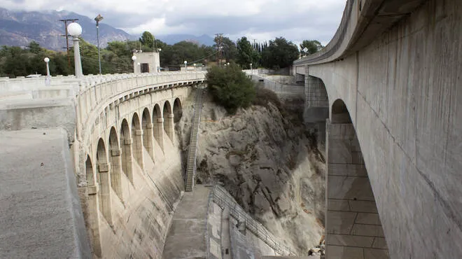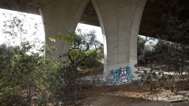 The trail starts at the end of La Canada Verdugo Road, a perfectly pleasant cul-de-sac that gives way to a bleak path across the dam. I’m already feeling silly at this point: There’s nothing more than a dried up river bed and some majestic concrete arches. You can even see the top of the so-called Satanic rock from the top of the dam—no black clouds, no swarms of bats, no billowing fireballs. The scariest thing so far is a slight chance of rain and a single piece of graffiti that looks somewhere between an alchemy rune and the Eye of Sauron.