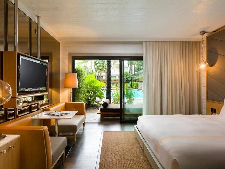 The swimming pool at the Roosevelt might be the most famous pool in L.A. That’s thanks to the mural of blue, wave-like forms that pop artist David Hockney painted on its interior walls in 1988. As such, the pool is the hotel’s focal point; there’s a buzzing bar, the Tropicana, as well as a daytime cafe, and regular evening events open to guests and visitors, from movie screenings to nighttime pool parties soundtracked by some of the city’s most interesting record labels. If you’re not a pool person, then there’s a spa, fitness center, and yoga classes for hotel guests.