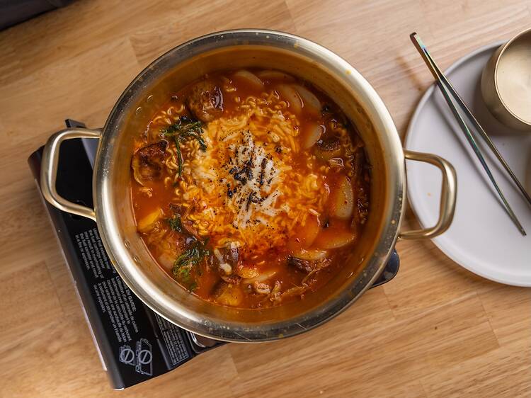 The chef-owner, who has appeared on Food Network Star, Chopped, and Morimoto's Sushi Master, darts around the long, narrow dining room delivering platters of jangjorim (wet beef jerky) and fish jerky to tables, sharing her story in the process. Kimchee is made with salt and shrimp, the Northern Korean way, as opposed to the fish-and-oyster style down south. Paired with tofu and crispy pork belly, it's a delectable dish—best with a side of barley rice, which holds sentimental value for North Koreans since the communist regime banned white rice at markets (barley’s the next best thing).