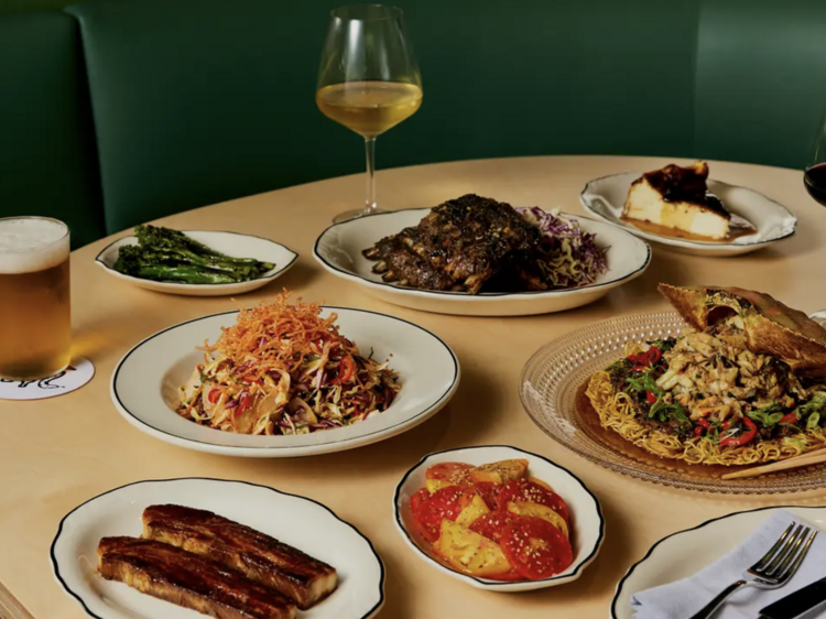 The space, designed by the team behind Momofuku Noodle Bar, is pure L.A. sunshine. Floor-to-ceiling green tiles, an open kitchen wrapped in electric orange and a kinetic flap board (in a nod to Momofuku’s New York roots) stand out in the midst of Century City’s high-shine crowd. A covered patio under a green metal canopy is perfect for people-watching and happy-hour lounging.