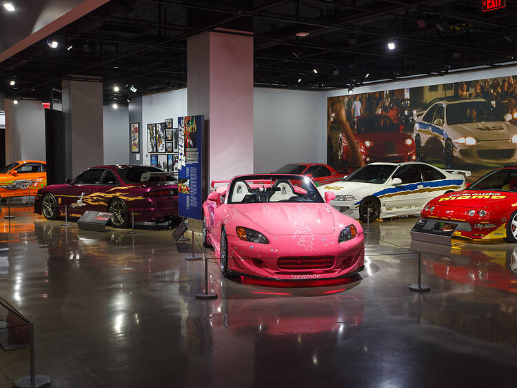 It’s a very Fast & Furious kind of year in L.A. between Universal Studios’ roller coaster and this 25th anniversary exhibition. While the Petersen’s exhibition is certainly encyclopedic (the selections here span the entirety of the franchise, with a particular focus on the first three films), it’s not overly academic: Brief labels will let you know the story behind the stunt car you’re staring at, but this is ultimately an opportunity to ogle American muscle cars and custom Japanese imports (as well as the franchise’s melodramatic quotes about family). Highlights on display include the 1993 Toyota Supra “Stunt #3” and 1995 Mitsubishi Eclipse driven by Brian O’Conner (Paul Walker) in the original film, Dominic Toretto’s (Vin Diesel) 1968 Dodge Charger R/T and 1993 Mazda RX-7, and Suki’s (Devon Aoki) very pink 2001 Honda S2000.