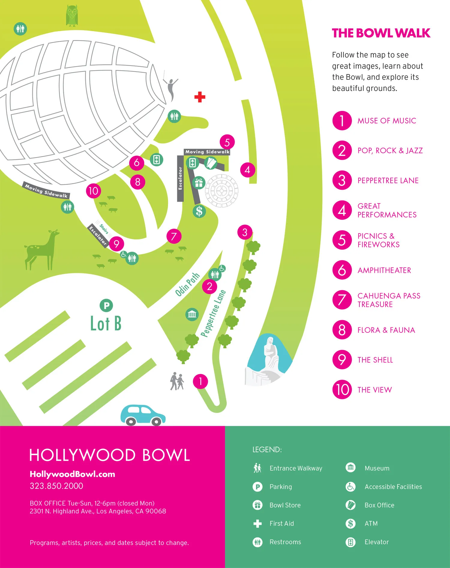 Visiting the Hollywood Bowl Walk is a cinch during all but the Bowl's peak season (July through September). Occasionally the setup for a performance may limit access among the Bowl's grounds and walkways, while anything beyond the entrance plaza is limited to ticketholders during a show. You'll want to make sure to check the Hollywood Bowl calendar or give audience services a call (323-850-2000) to see if there are any park closures. The park hours are technically sunrise to sunset, but again, performances may limit your time in the area. Parking is free during the day in Lot B and Lot A, though it's limited to performance parking typically about four hours prior to showtime.
