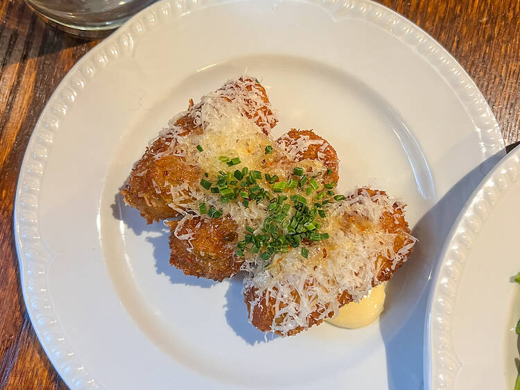 Gruyère and leek croquettes ($15 for three pieces) are another nod to Spain and its colonial culinary reach, finished with a drizzle of hot honey that reflects the condiment’s recent mainstream rise. They taste good – as most things deep-fried and filled with cheese do – and make a nice drinking snack. They also appear as an accompaniment to the lamb rump with mint pesto and cavolo nero.