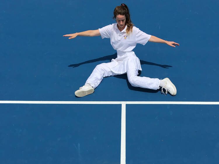 The word that best describes the work of Atlanta Eke is “unique.” Her previous productions have seen her push the boundaries of modern dance in utterly unexpected directions, often introducing familiar technologies and media into obscure, defiant contexts. This Eke trademark is on full display in this world premiere, as she and three other performers de-construct the courtly dances of Renaissance France to reimagine the Tennis Court Oath, a pivotal event of the French Revolution, all while dodging 400 tennis balls being launched at them.