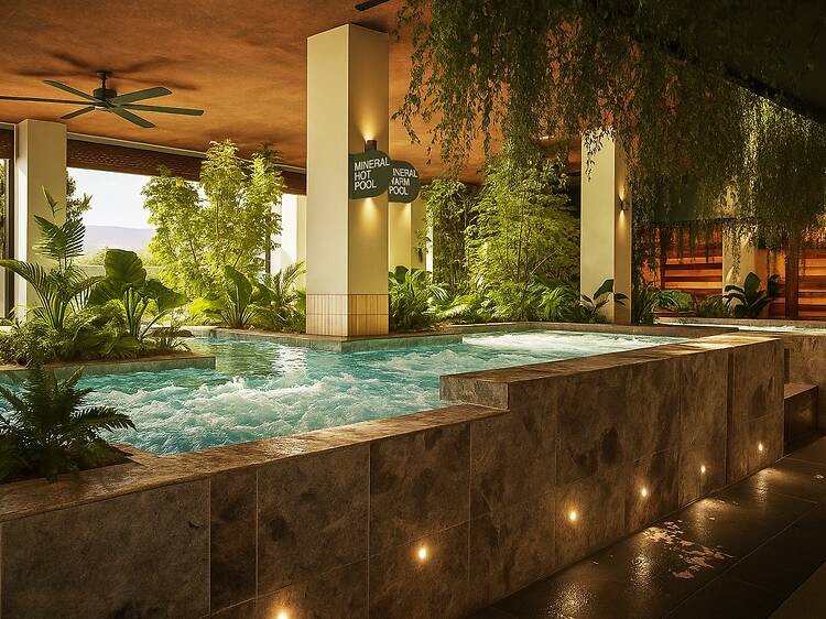 Spanning roughly 700 square metres, the bathhouse will include magnesium-rich hot and warm mineral pools, a cold plunge, cedarwood saunas and steam rooms, plus infrared sauna, red-light therapy rooms and massages available to book on request.