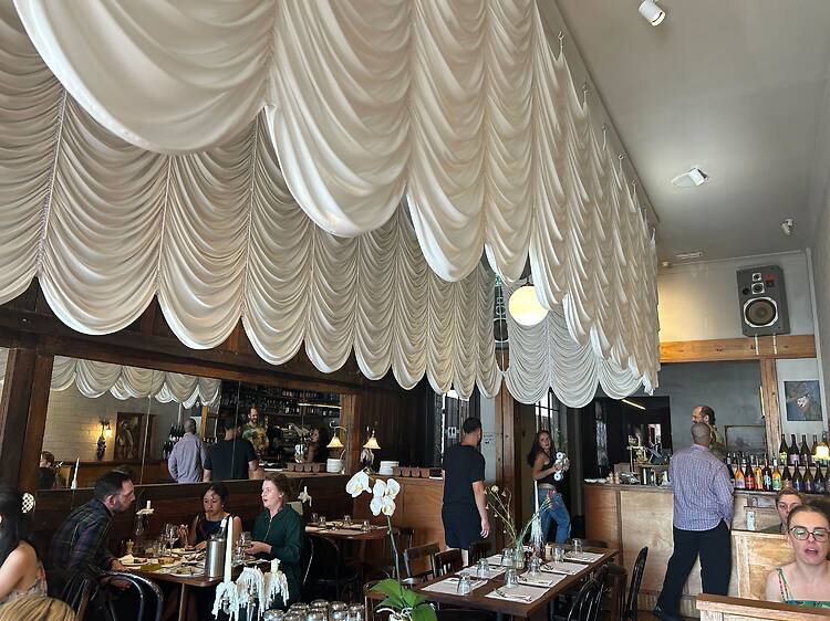 With a 5pm booking locked in (in my defence, I was heading to see Wuthering Heights at 7.30pm – but also, early dinners for the win!), I wasn’t sure the vibes would be pumping upon arrival. But within half an hour of sitting down in a two-seater booth, this charming spot has filled up entirely with a jovial mix of patrons spanning couples on date nights, friend groups and gals fuelling up before a night on the town.