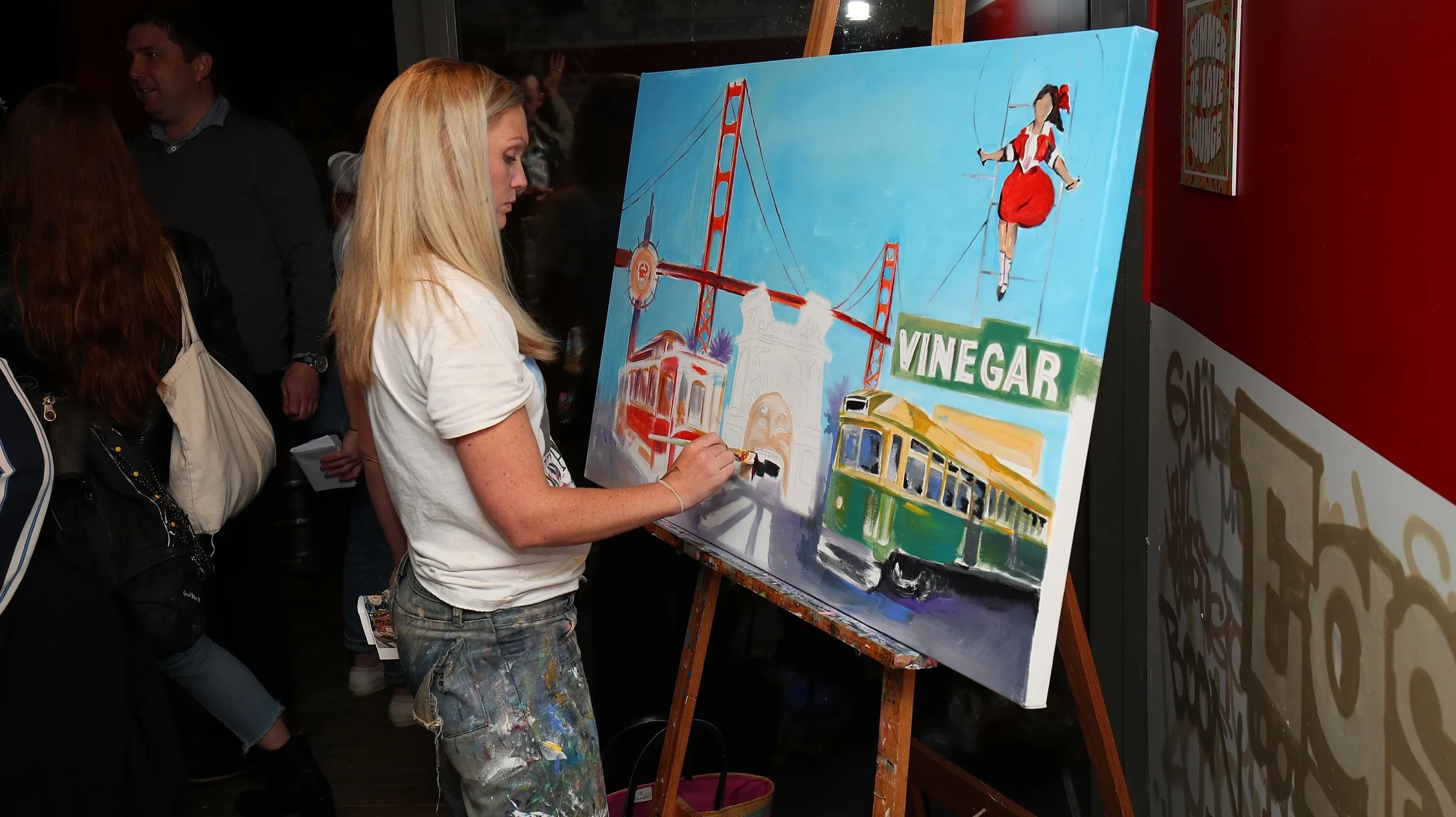Artist Madeleine Simson painted a Melbourne-San Francisco scene on canvas, in which Skipping Girl Vinegar looms over Luna Park.