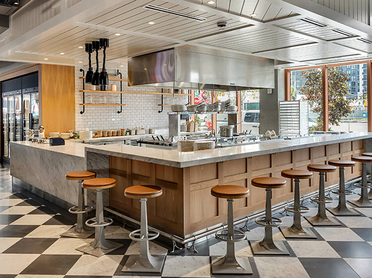 The new space is organized around 10 distinct stations, meaning you can bounce between fresh pasta made to order, wood-fired grill dishes, crudo and sushi, pizza and panini and a full aperitivo-style bar. There’s also a produce-forward station for lighter fare, plus dedicated spots for gelato, coffee, bread and desserts. If you’re the type of diner who struggles to commit to one cuisine (or have a very hard-to-please friend group), this is very much your place.