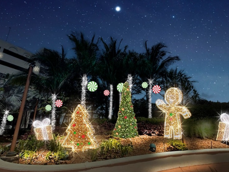 Other standout scenes among the 20 displays are Frozen Flame, where ice sculptures shimmer' Santa's Celestial Ride, where Santa and his sleigh climb into the sky surrounded by glowing orbs; Starlight Boulevard, with a dozen illuminated star arches; Glowing Palm Paradise, where 28 palm trees—part of the traditional look of this Florida hotel—transform into a tropical Christmas look; and the Whimsy Woods, with elves and gnomes.