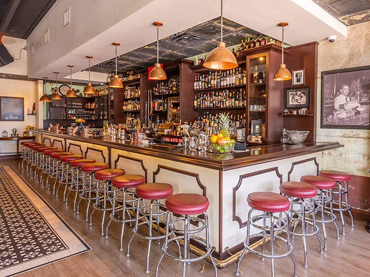 Across town, Café La Trova offers something closer to a full-on experience. Set just off Calle Ocho in Little Havana, it blends restaurant, bar and live music venue into one space—dinner service gives way to dancing and the bar fills up with guests enjoying a menu rooted in classic Cuban cocktail tradition.