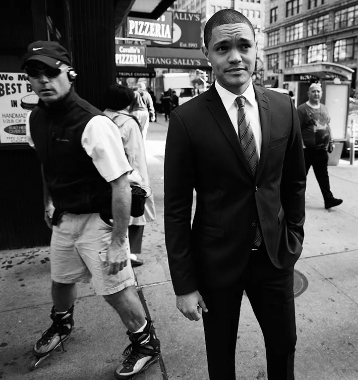 "Trevor Noooah!” That’s the first thing I hear when I arrive at our on-the-street photo shoot. The yelp came from one of two blushing teenage boys who’d spied The Daily Show with Trevor Noah host across the street. Then, a minute after they pulled their caps down and sank into the Friday morning pedestrian traffic along Seventh Avenue, a thirtysomething brunet chirps, “You’re killing it!” Others approach with phones in hand, asking for selfies. Trevor Noah, it appears, has arrived.