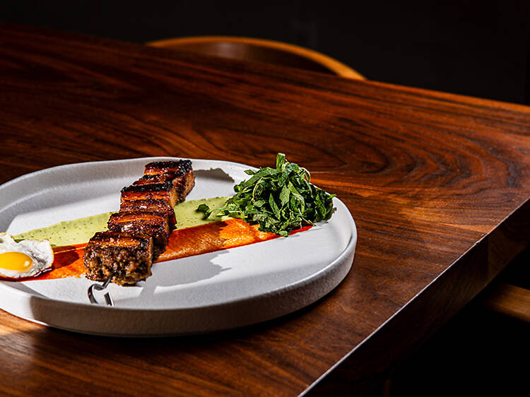Signature dishes include Viking Village scallops with pickled napa cabbage and calabrese sausage, mahi mahi ceviche brightened with mango, passionfruit and leche de tigre and Santa Barbara uni paired with burnt eggplant, candied ginger and a yuzu granita. One of the more unexpected items is a riff on a New York classic: a chopped cheese made with koji-aged wagyu, Cooper cheese, Kirby kimchi and truffle.