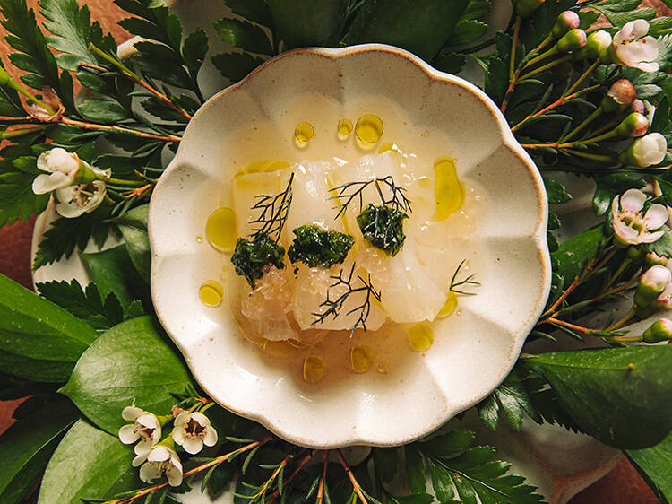 Designed by Ouimette herself, the space leans into a modern wabi-sabi aesthetic, with natural textures and muted tones that keep the focus squarely on the interaction between chef and guest. The counter offers a 16-course tasting menu priced at $220 per person, built around seasonality, fermentation and the careful aging of ingredients. The experience lasts about two hours, with dishes evolving throughout the year based on seasonal sourcing.