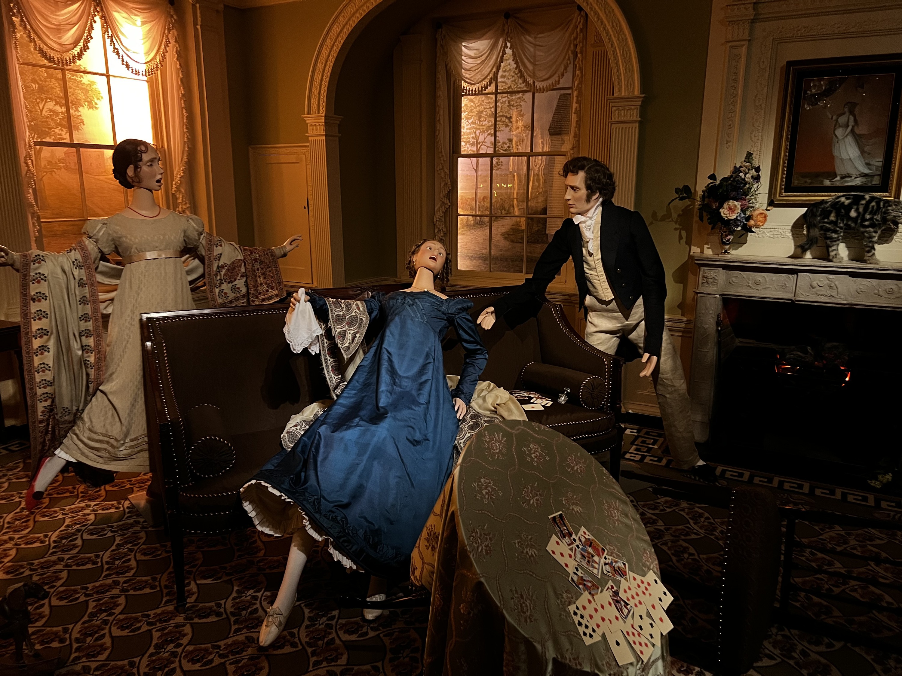 Not surprisingly, with the eye of so many famous directors behind the various stagings, there are plenty of small, attention-worthy details that can be found throughout the period room scenes. Don’t miss the text bubbles floating above the mannequins’ heads in the Baltimore Dining Room which reprint contemporary American gossip about the socialite Elizabeth Patterson Bonaparte, the eerily levitating figure in the Shaker Retiring Room that is meant to portray Shaker leader Mother Ann Lee or the guest in the Rococo Revival Parlor wearing a dress that was once worn to John F. Kennedy’s inauguration.