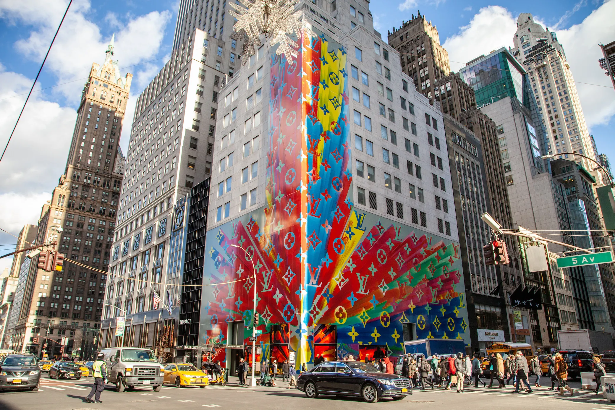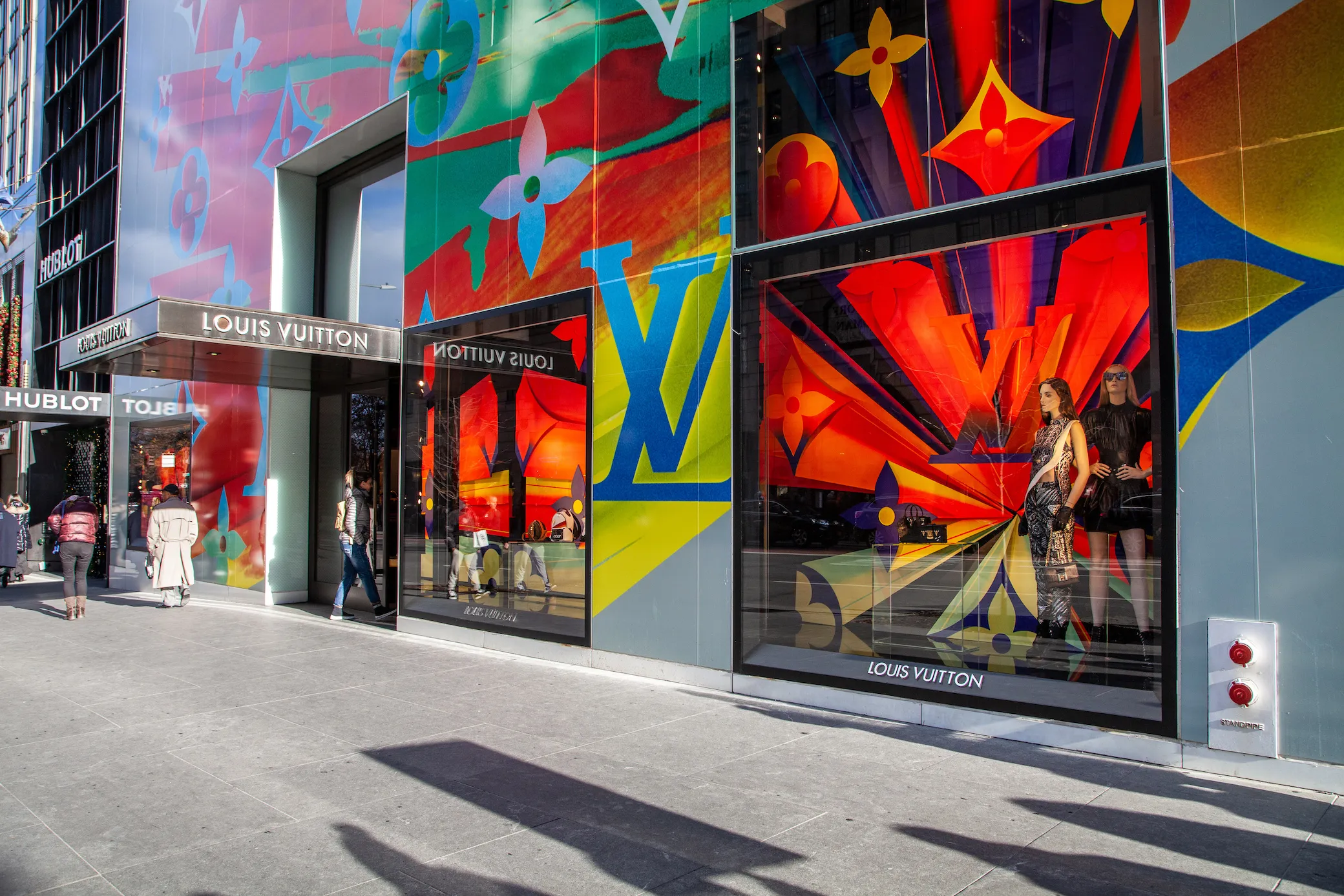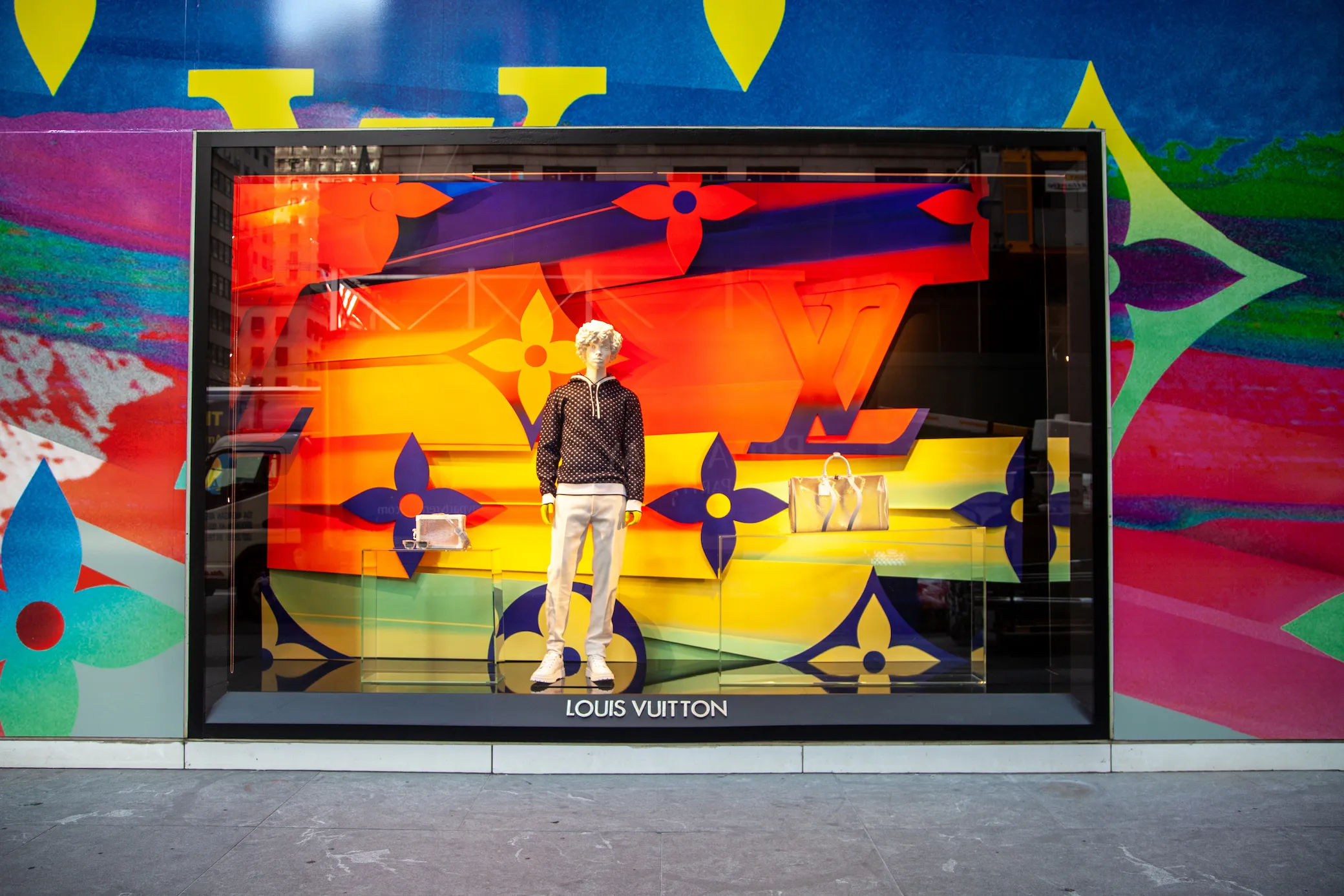 Speaking of "a lot of color," Louis Vuitton has decided to go big or stay home. Or maybe both. Bright colors mark their window spread this year, and while it doesn't have much at all to do with the season, you can't deny the wow factor: a rainbow explosion of color is the centerpiece here, spraying all the way up two whole sides (!) of the building.