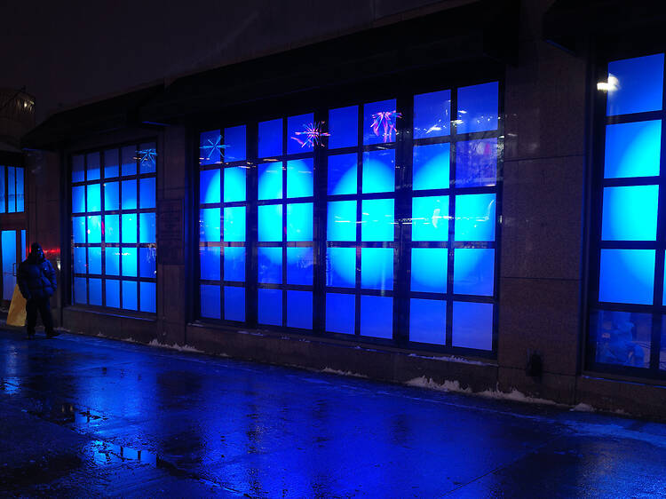 The project, called In Every Transition, A Pattern, takes over the block-long windows of the former department store, transforming a retail void into something closer to a public artwork. It runs through March 16 and is best experienced after dark, when the glass comes alive with kaleidoscopic patterns.