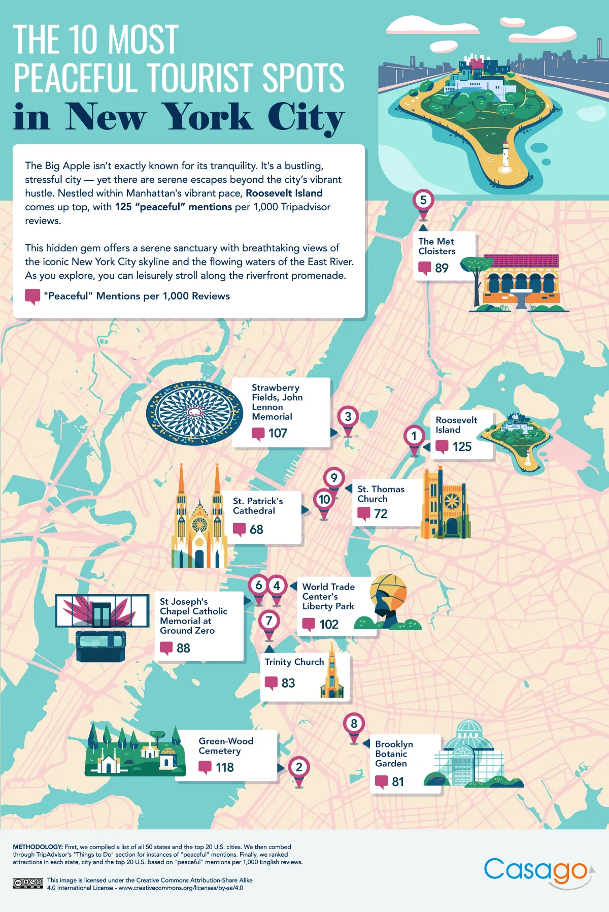 Casago, a vacation rental property management company servicing homeowners and guests in Mexico and the U.S., actually did a study to find the most peaceful tourist spots across the U.S., and found that Roosevelt Island is New York City’s top spot to find some zen.