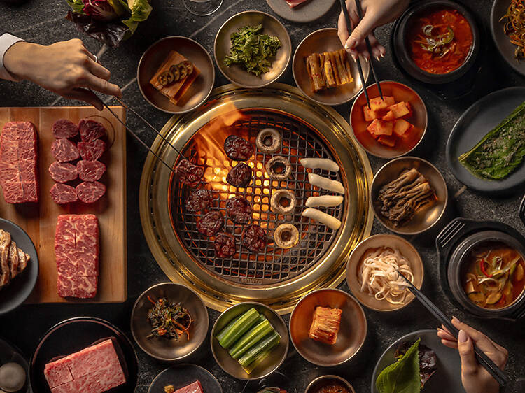 Downstairs, at Cote 550, the subterranean dining room embraces the brand’s signature mix of Korean barbecue and chophouse energy, with smokeless grills at every table and a jungle of greenery overhead. The menu sticks to what works—the $118-per-person Butcher’s Feast, a parade of dry-aged beef cuts with banchan and stews—alongside a few location-specific additions like tableside japchae.