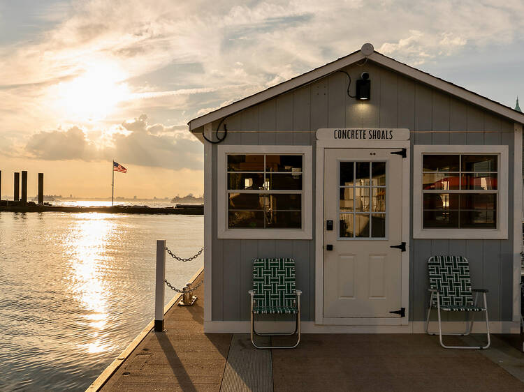 From the team behind Sean Feeney’s Fini Pizza, Concrete Shoals feels more like a nautical clubhouse than a bar: rattan café chairs, hunter green Adirondacks and picnic tables are scattered along the dock, perfectly angled toward the harbor’s golden-hour show. The views are free, but you’ll need to book ahead for a seat—the marina gate only opens if your name’s on the list.