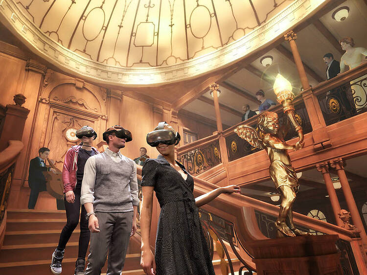 The engine room hums and shakes before your eyes and the labels on the wine bottles that waiters hold are clear enough to read. The tactile cues are strong but not gimmicky: a bell rings if you brush it, a railing vibrates slightly under your hand and you can turn the steering wheel as the ship inches towards the iceberg. It is easy to forget you’re wearing a headset.