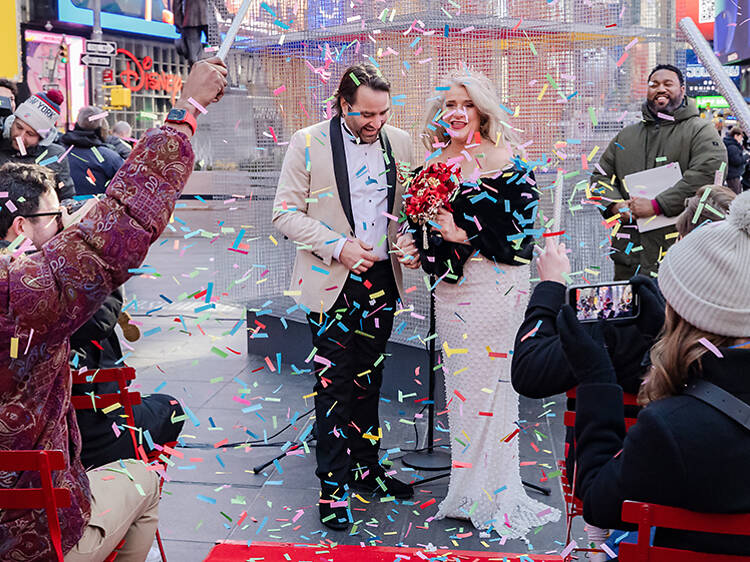 Yes, that’s right: some couples will literally pop the question on the massive Everest billboard. The day’s schedule includes two surprise proposals at 11:30am and 12:30pm, sandwiched between two wedding ceremonies at 11am and noon in Duffy Square.