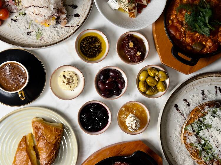 Last year, four friends decided to open a restaurant in the West Village. Fittingly, they named it Foursome. Personal touches from the tetrad themselves are found throughout the restaurant, including a black, white, and yellow mural of the group steering a ship and images of one of the owner's dogs, donning a crown on its head—as all good boys (and girls) deserve. But the restaurant has become a favorite of the neighborhood for its all-day menu of eats that flit across the Mediterranean, with special attention to the Turkish region, given that the kitchen is run by three Turkish chefs. Following the ethos that breakfast is the most important meal of the day, the restaurant whips up an Aegean brunch option that really puts on the works—think a bread basket of sourdough and simit (a Turkish bagel), feta and halloumi cheeses, tiny bowls of olives, jams and fresh honeycomb and a hot pot of Turkish tea to split.