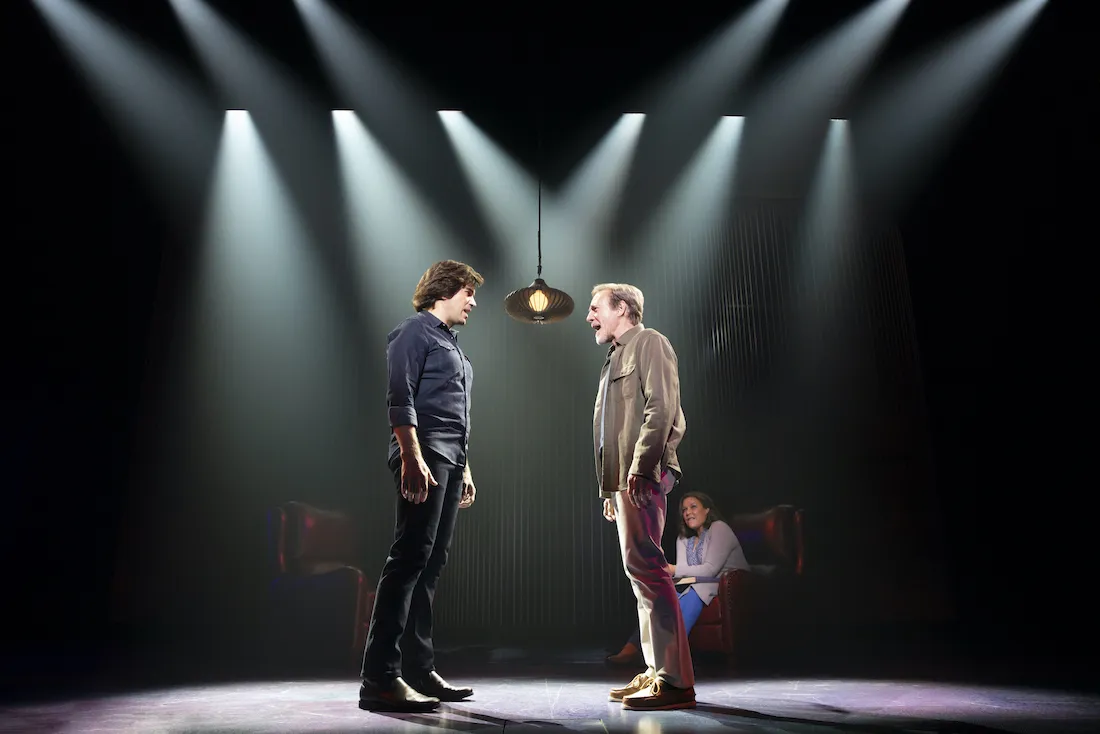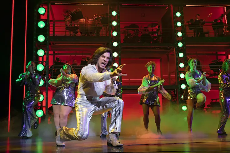 Nearly all of the songs are performed diegetically, which is to say as Neil Diamond songs performed by Neil Diamond within the world of the narrative: auditioning at the Brill Building, starting out at the seminal West Village talent incubator the Bitter End, taking the stage in major venues. The few occasions when they are treated as musical-theater character songs tend to be in the service of giving his ex-wives something to sing: high-school sweetheart Jaye (Jessie Fisher) gets “Love on the Rocks,” and the more assertive Marcia (Robyn Hurder) gets “Forever in Blue Jeans”—an audience favorite, thanks to Hurder’s rockin’ combination of dance and belt—as well as the inevitable “You Don’t Bring Me Flowers” when things fall apart. The production numbers are buttressed by Emilio Sosa’s flashy costumes and Stephen Hoggett’s groovy, springy choreography, and the ensemble is well-served throughout: Star dancers like Jess LeProtto have moments to pop, and Jordan Dobson gets a prettily sung solo number. And there are hints throughout of Diamond’s struggles with a depression he calls “clouds,” and that he is essentially, as one of his catchiest songs suggests, a “Solitary Man.”