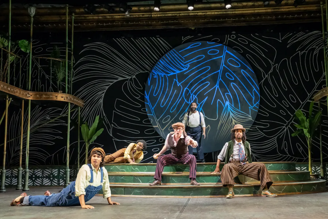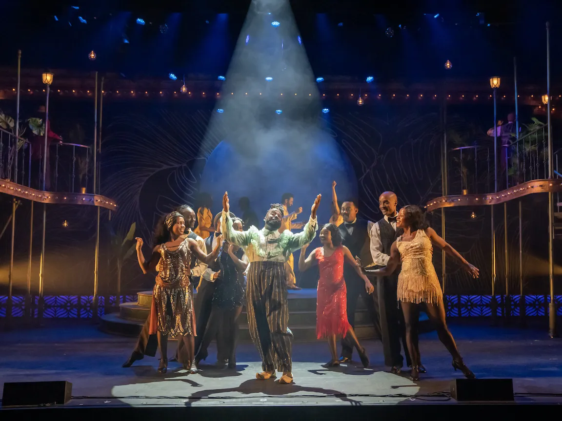 Doubling as the welcoming emcee Philostrate and the playful sprite Puck, Mykal Kilgore commands every scene he's in, belting out songs by Duke Ellington and the Gershwins with backup dancers in tow. The four lovers in a daisy chain of romance—hopelessly devoted Helena (Noah Michal), who adores chilly Demetrius (Brandon Carter), who is betrothed to Hermia (Ra'Mya Latiah Aikens), who only has eyes for Lysander (played by understudy Marcus Fitzpatrick at the performance attended)—are the play's beating hearts. Queen of the Fairies Titania (Jesmille Darbouze), who's tricked into falling for a literal ass by her meddling mate Oberon (Victor Williams), gets short shrift in the streamlined script, but perhaps that’s for the best: Mega-comedian Russell Peters, who officially plays the dunce-turned-donkey Bottom, is scheduled to be out for most of the run. Happily, his understudy Jaylen D. Eashmond is excellent, and a great improviser to boot. (His off-the-cuff, in-character response to a barking dog earned howls.)
