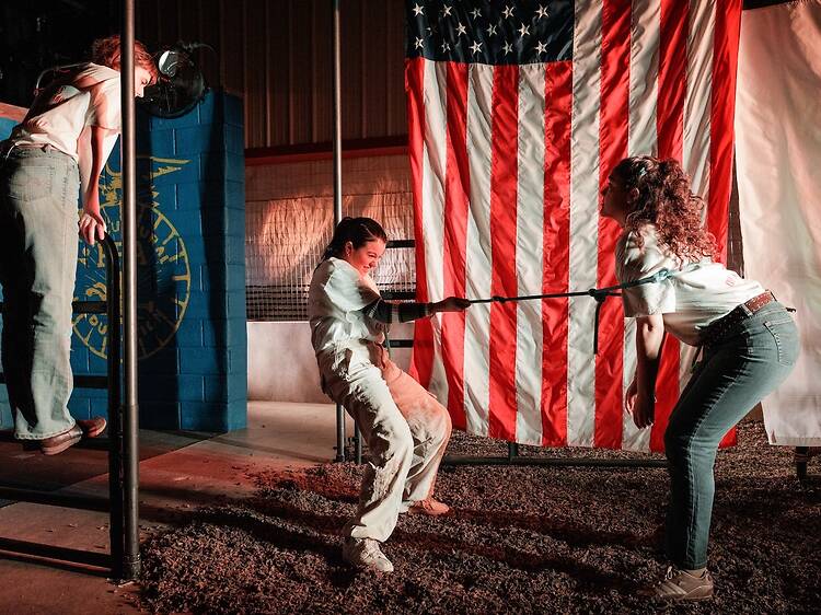 On Cate McCrae's woodchip-strewn set, cooled by four industrial fans, the girls bond and bicker (sometimes over liquor) as they tend to their heifers and haltingly discuss their faith, relationships and futures. Religion and prison rule their insular and conservative community, where everyone seems connected to an inmate or a corrections officer. The headstrong Sofi hopes that winning the calf contest could be her ticket out, but her cohorts have more domestic dreams, even the ones who are too scared to reveal their authentic selves for fear of the town's wrath.