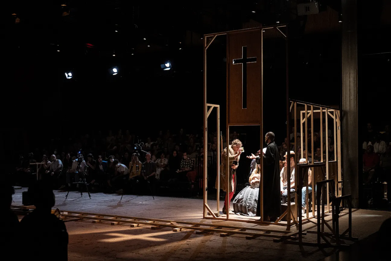 An inexhaustible cast of one white and six Black actors engages in a tongue-in-cheek minstrelsy, broadly portraying characters of all genders and backgrounds, like kids playing very bloody make-believe with whiteface, wigs and guns. They even enlist the audience to help: Be prepared to be preached to, sold at auction or hidden from gunslinging outlaws. Many sections of the text, especially the narration, are also shown via live video feed, both as a nod to the show’s send-up of classic movie tropes and as a way to see around the town’s new structures.