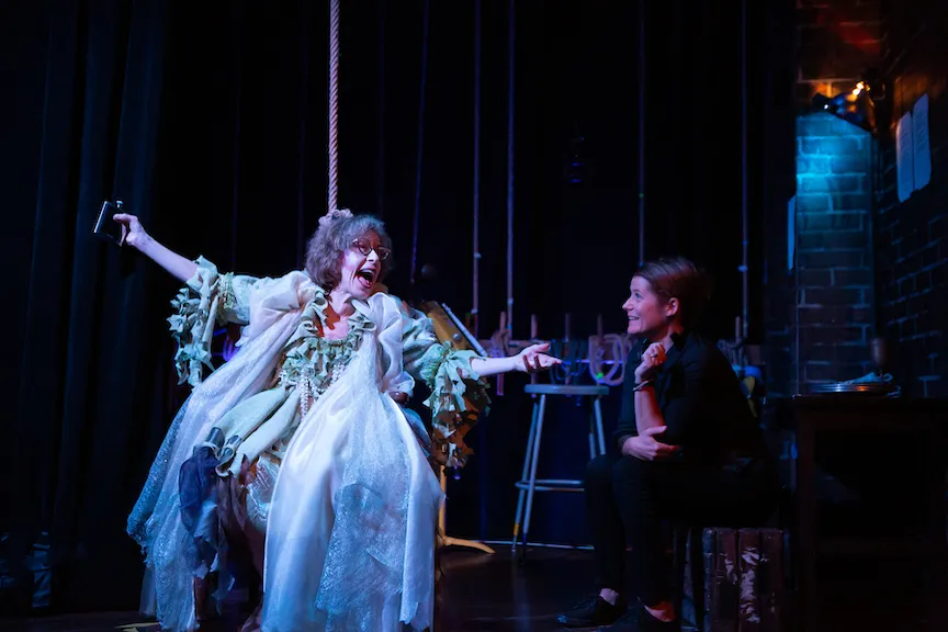 The new play Fruma-Sarah offers a rare chance to see Hoffman center stage—even if, ironically enough, she’s stuck in the wings the whole time. In E. Dale Smith's 75-minute comedy, Hoffman stars as a cantankerous real-estate agent and community-theater actress named Ariana Russo, who is playing a tiny role in her New Jersey company’s latest production of Fiddler on the Roof: the vindictive ghost Fruma-Sarah, a shrieking and pearl-clutching harridan who flies onstage in the musical’s nightmare sequence. But her big entrance and rapid exit come an hour into Fiddler’s first act, so Ariana has plenty of time to loiter offstage and loudly bend the ear of the strapping Margo (Kelly Kinsella), the patient substitute crew member in charge of her flying apparatus. (Extra meta points: Hoffman herself played Yente in Fiddler’s most recent New York revival.)