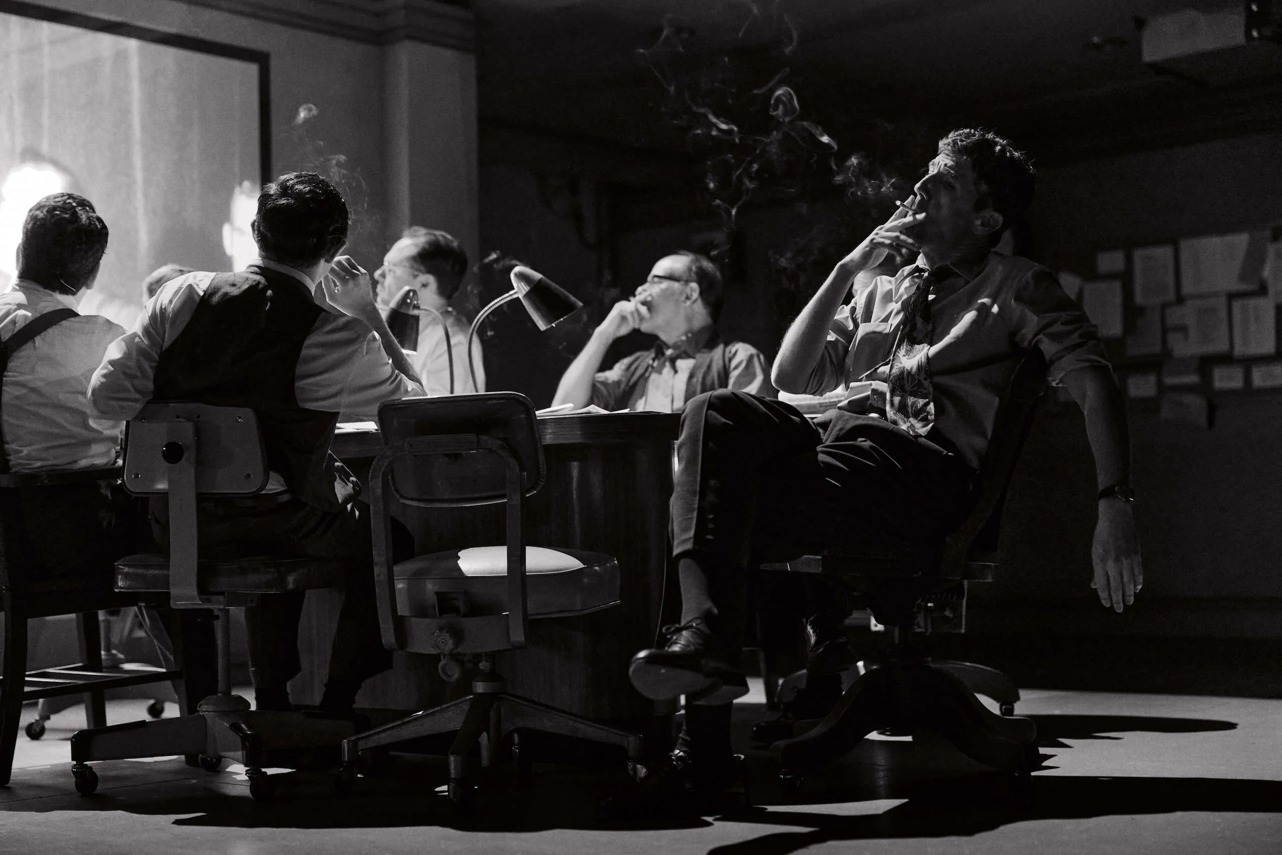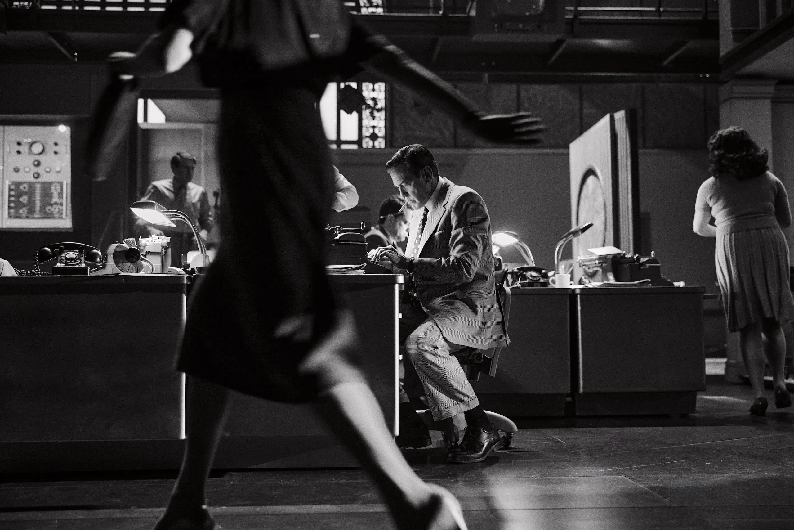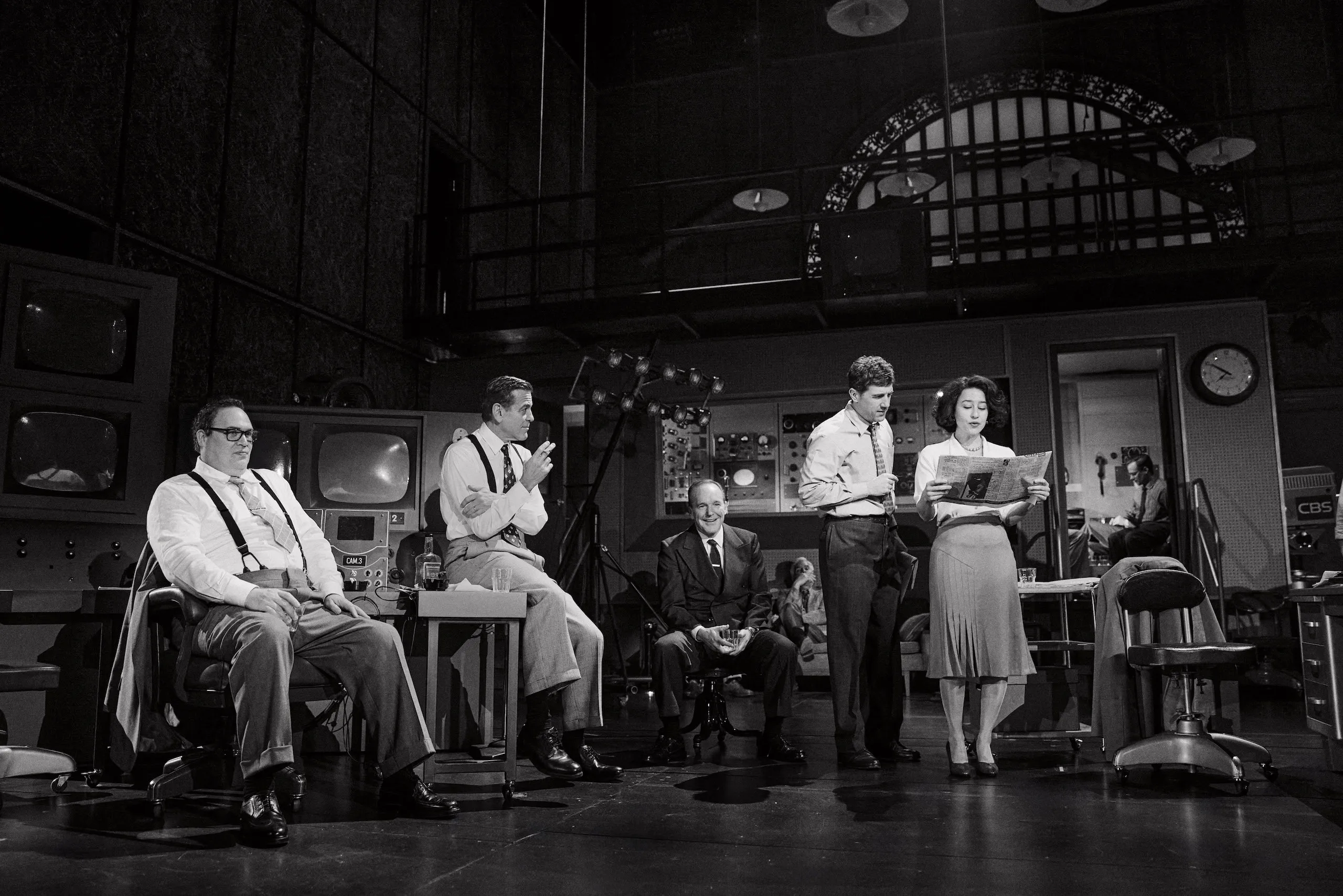 That’s because, in nearly every regard, Clooney and Heslov have just plopped their screenplay onstage and called it a play. Presented live on Broadway, Good Night, and Good Luck is still a 2005 film about the 1950s TV journalist Edward R. Murrow. One central character has been cut for economy, and some creaky screwball banter has been added for humor. But almost every scene from the screenplay is here, often line for line and in much the same order; a large portion of the dialogue consists once more of verbatim quotes from the historical record and real documentary film clips of McCarthy and others. The extent of the faithfulness is, at times, jaw-dropping. For example: The film begins with a montage of chummy tuxedoed men at a gala event, scored to the jazz standard “When I Fall In Love”; the play has no montage, of course, but it keeps the opening song anyhow—now delivered in full by a live singer behind a scrim, in the smooth style of Ella Fitzgerald’s songbook records. (That singer, the rich-voiced Georgia Heers, returns throughout the night to perform the songs Dianne Reeves did onscreen, backed by live musicians.)