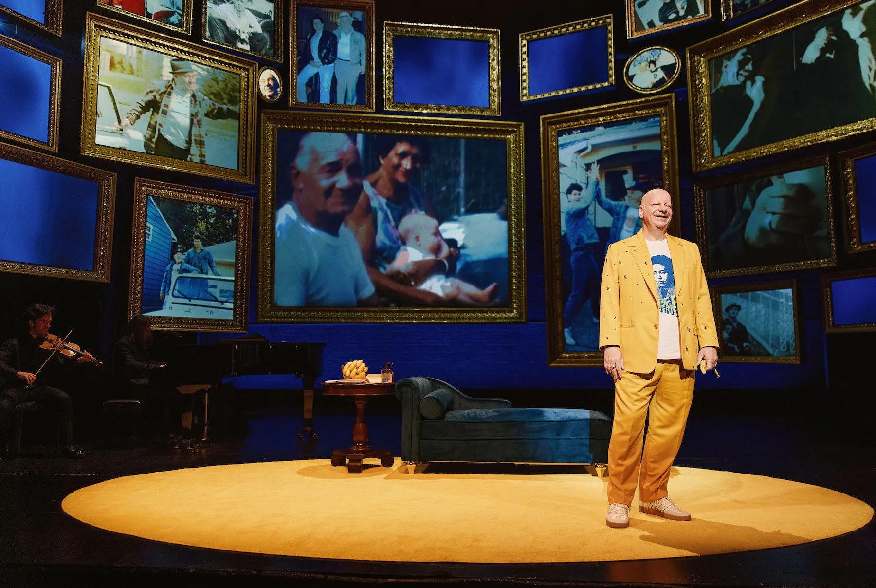 Jewish comedy is perhaps both a product of and a defense against the suffering that being a Jew has often entailed throughout history. But the particulars of Ross’s life have given him an extra share of heartache. “I learned early on that comedy wasn’t just in my blood,” he says. “It’s my superpower. And this is my origin story.” What follows is a litany of loss. Directed by Stephen Kessler and dramaturged by Mike Birbiglia's longtime consigliere, Seth Barrish, Take a Banana for the Ride is not a comedy routine per se but a nostalgic journey of gratitude salted with off-color jokes and out-of-tune singing with an onstage pianist and fiddler. There are many photos and home movies of his New Jersey childhood in the 1970s; there’s a love letter that his father sent to his mother in college. But above all, there’s death.