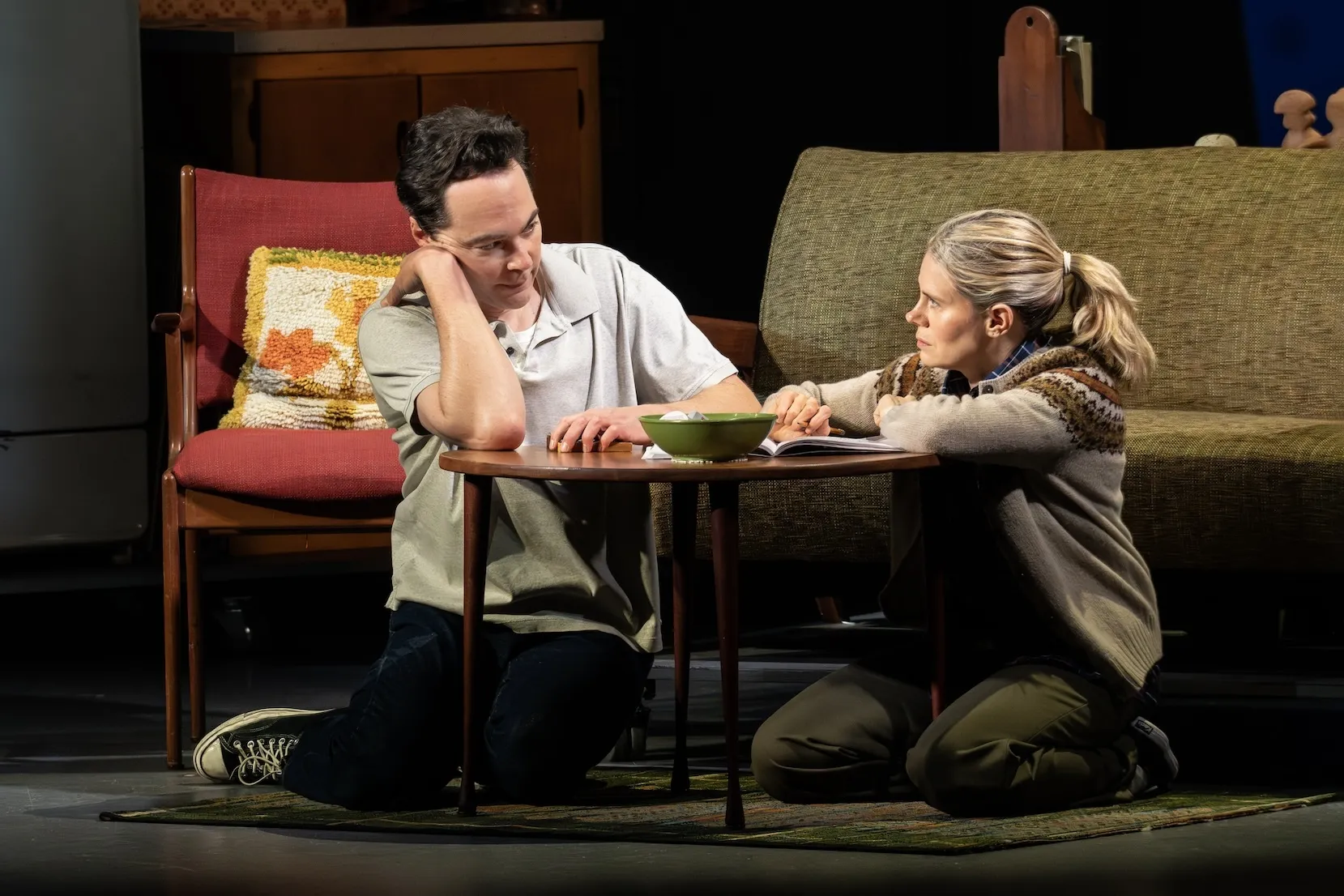 Much of the play unpacks the baggage that Phyllis saddled on her children: the mother load. Celia Keenan-Bolger portrays Martha, the play’s name for Vogel fille, from early-1960s tweendom to roughly present late-middle age, and Jim Parsons is the playwright’s older brother, Carl, who died of AIDS in 1988. Vogel dealt with Carl’s story in her breakthrough work, 1990’s The Baltimore Waltz, but in a highly stylized way: She inverted it into an absurdist film-noir spoof about a wild European adventure. Mother Play takes a far more straightforward (though very queer-forward) approach. It has a magical elements, which are given their due in Tina Landau’s staging—a bottomless handbag, dancing roaches—but for the most part it presents its story as personal evidence. (The play includes a real-life letter from Carl, in which he wittily plans his own funeral, that was published as background in the introduction to the The Baltimore Waltz.)