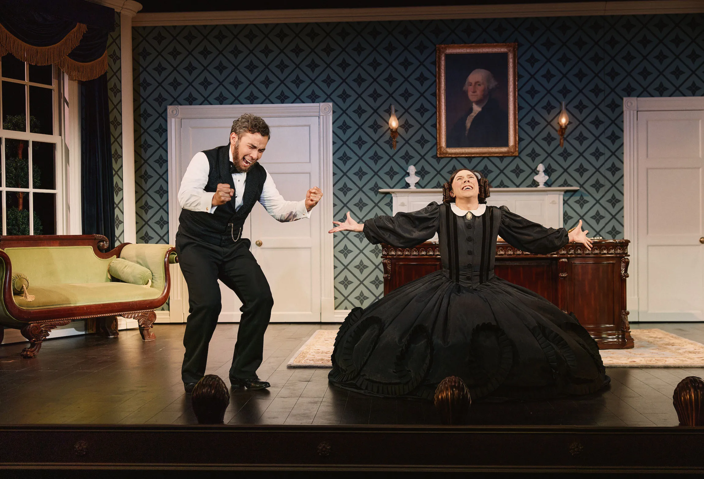 But other than that Mrs. Lincoln, how is the play? Happily, it’s a transhistorical delight: a very 21st-century comedy about a 19th-century tragedy as filtered through a lens of 20th-century movie dramas. Director Sam Pinkleton never lets the comic energy flag, and the supporting cast is delicious. Conrad Ricamora plays the not-so-honest Abe, consumed with lust for a young male underling (Tony Macht); James Scully is a handsome drama coach with whom Mary strikes up a forbidden romance, and Bianca Leigh is Mary’s prim chaperone. It would be unsporting to spoil any of the comic twists—some of them cheerily raunchy—that the play springs on the audience, but everything comes together (on a perfectly stagey set by the design collective dots) to create an instant classic.