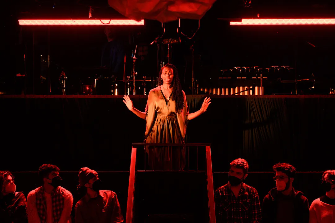Those familiar with Christian's background—she's described her upbringing as "avant-garde Catholicism"—and with her previous shows (I Am Sending You the Sacred Face, Animal Wisdom) know that ritual and religion are threaded throughout her work. Fittingly, director Lee Sunday Evans's simple yet effective staging sometimes evokes a church choir, with the cast swaying and clapping in unison. Aided by Jeanette Oi-Suk Yew evocative lighting, scenic designer Kristen Robinson has completely transformed Ars Nova's Greenwich House, placing the audience in tiered seating in the round; the performers pass inches from your face and sing directly to you as they periodically descend to a small central playing space that is dominated by a glowing orb that suggests a nucleus or star.