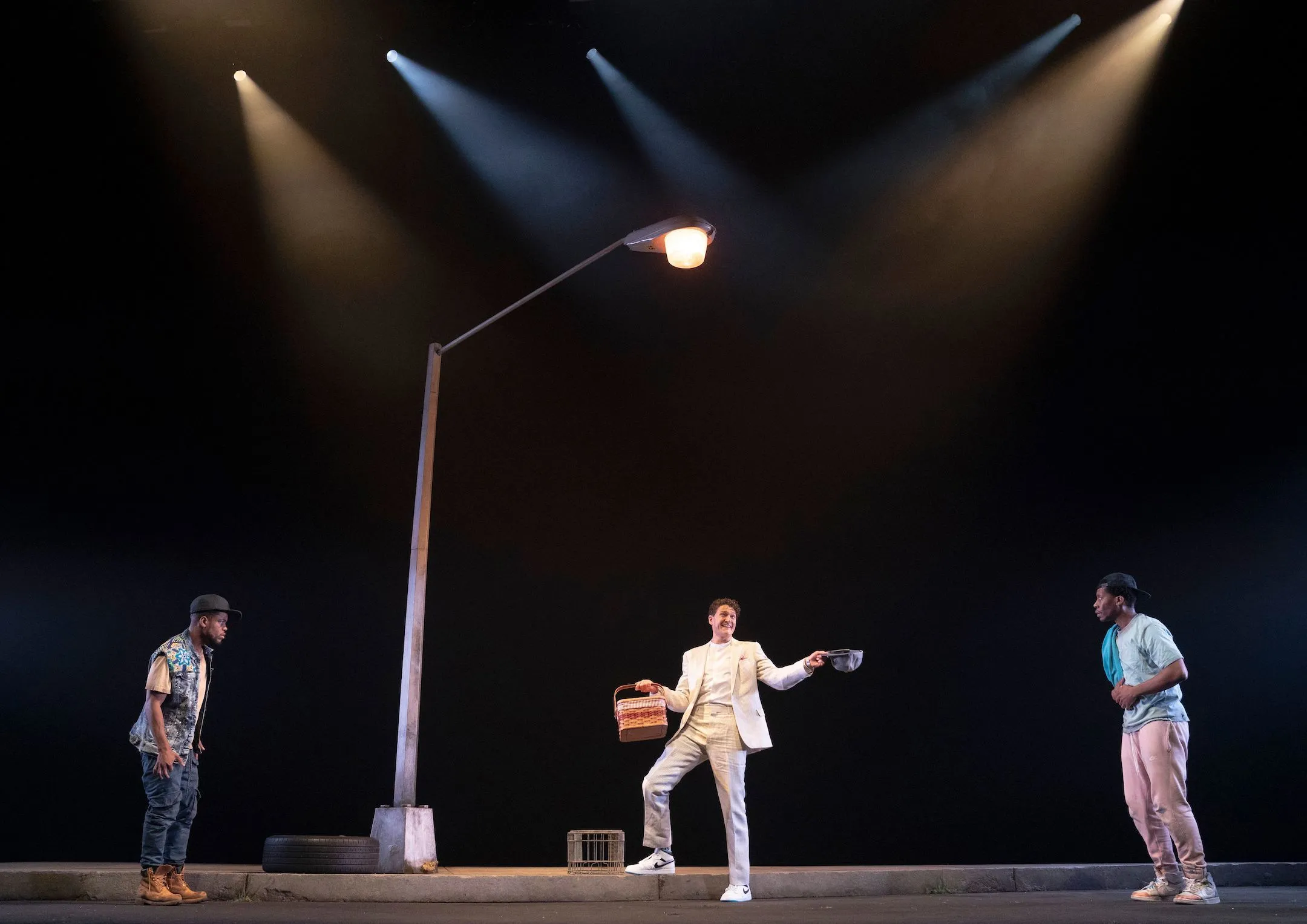This cop, called Ossifer, is portrayed by the gifted Gabriel Ebert, who doubles as Pass Over’s other white character: Mister, a wealthy fellow with a creamy linen suit and an air of befuddled gentility, who says things like “Gosh golly gee” and—in the show’s most memorable sequence—invites Moses and Kitch to join him for a lavish feast he unpacks from his picnic basket. (The collard greens and pinto beans are served on a silver dish.) Here as elsewhere, director Danya Taymor emphasizes the play’s embrace of theatrical artifice. Her 2018 staging of Pass Over at Lincoln Center’s small Claire Tow Theater, with this same cast, was already more heightened than the 2017 production at Chicago’s Steppenwolf Theatre (a version of which was captured on film by Spike Lee and is now streaming on Amazon Prime). The Broadway version is broader still, including a more spectacular new ending.