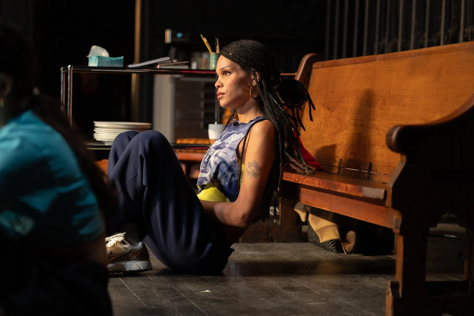 These actors are a motley group: overachieving party girl Savannah (Amandla Jahava); hypervigilant Yale dropout Angelique (Maya Margarita); flamboyant chaos agent Keeyon (Hayward Leach); easygoing Ro (Opa Adeyemo); try-hard Tristan (Omar Shafiuzzaman); self-effacing Latina heiress Mel (Karina Curet); gawky German transplant Rinni (Susannah Perkins). On their first day, they go through innocuous theater games and icebreakers—joined by Asa’s designer and nonmonogamous husband, Walton (Mark Junek), and dramaturg, Danny (Alex Wyse)—followed by a communal meal at which Asa invites them to embrace destabilization as the crucible of artistic growth. They nod along, brimming with credulous devotion, as Asa unveils a key instrument of their training: a chart inscribed with their names and a series of purported values. Each week, they are to mark where their colleagues “need some work,” to determine whether they require “no adjustments” or a more ominous “reassessment of your needs and our needs.” They willingly chart their own undoing, intoxicated by the validation it delivers at every step.