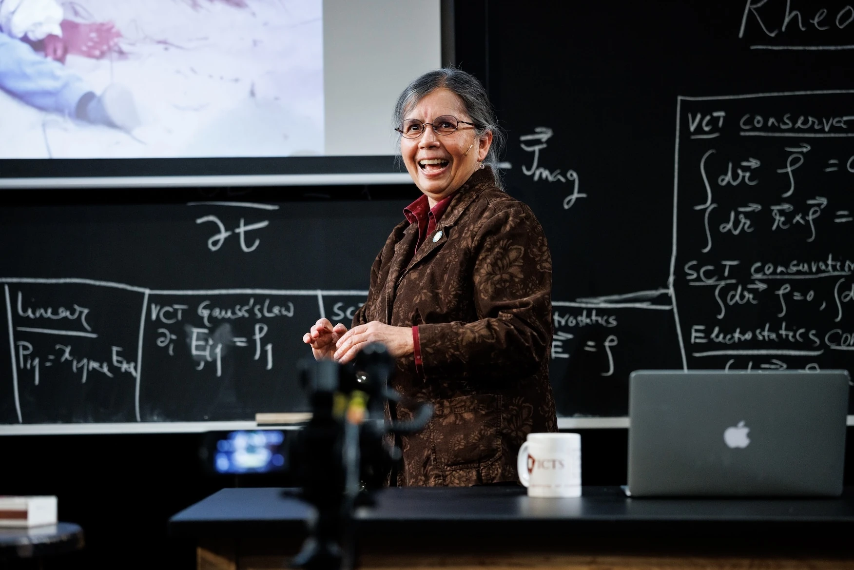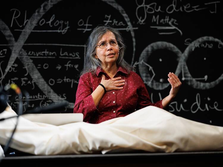 Not everyone’s mother is a theoretical physicist, and if yours is, she’s probably not as convincing an actress as Bulbul Chakraborty. Toward the start of Rheology—a play in which she co-stars with her son, Shayok Misha Chowdhury, who also wrote and directed it—Chakraborty leads the audience through a lecture on solids and liquids, but partway through it she starts coughing, then choking. On the night I attended, an audience member asked if she was okay; another told her to put her hands over her head to open her lungs. That’s when Chakraborty stopped choking—and flashed the audience a mischievous smile.