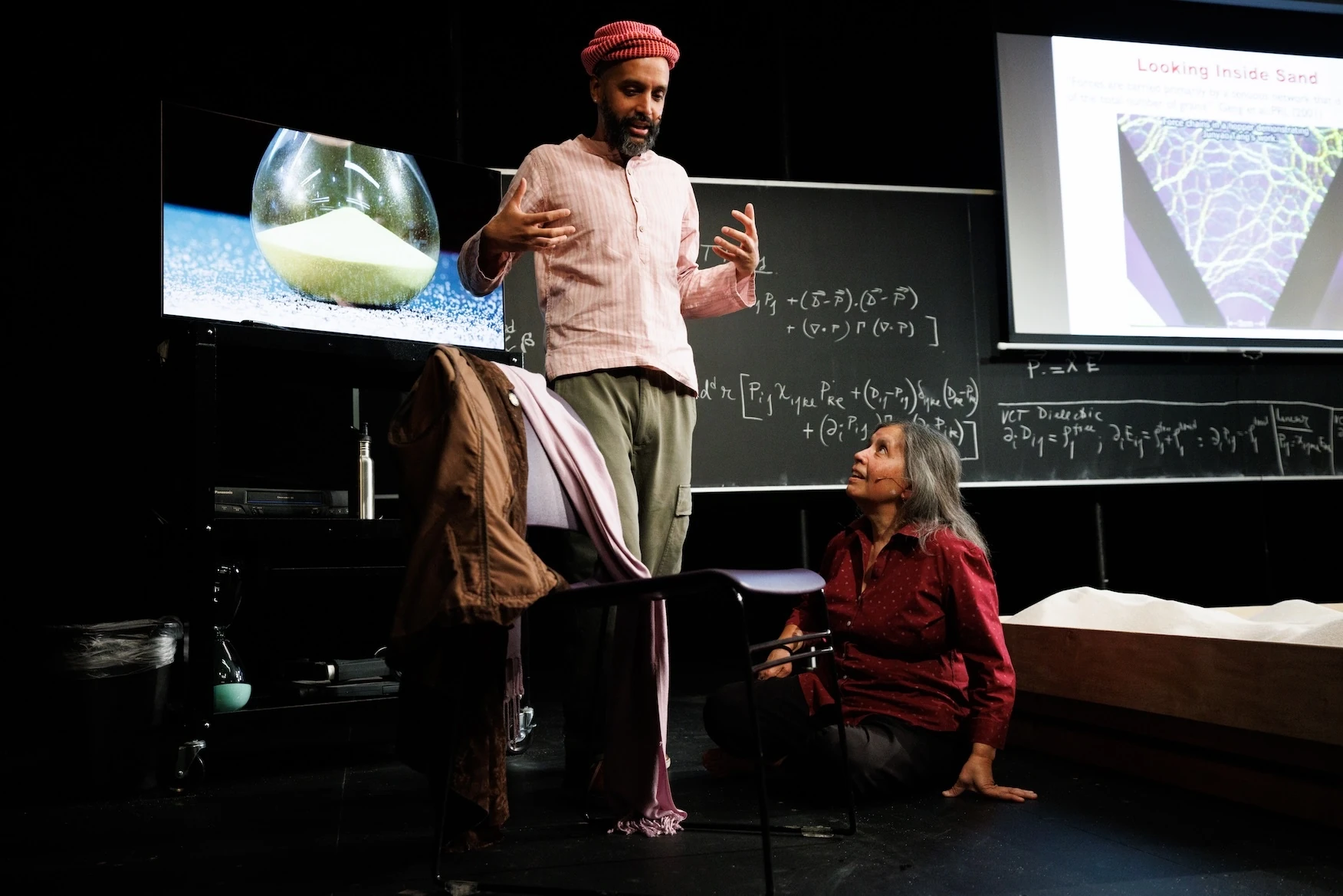 So begins a series of scenarios, from quietly poetic to deliberately melodramatic, in which Chowdhury imagines and confronts his mother’s death, using Rheology to address his fears through a language that he and his mother both understand: experiments. She’s a scientist, he’s a theatermaker, and though their fields may seem light years apart, they share obsessions with questions, curiosity and play. Chakraborty’s work is in rheology—the study of the flow of matter—and focuses on sand. In one affecting scene, Chowdhury plays in a sandbox alone before digging up a sieve, a castle mold and finally, deeper down, the bones of a skeleton; at that moment, on Chakraborty's nearby lab table, an hourglass drops its final grain. But then, Chakraborty—who has the charm of your favorite high school teacher—turns the hourglass over, resetting it.