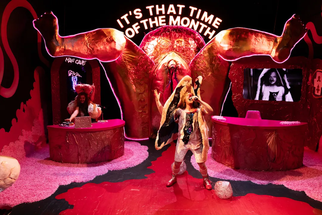 Amanda Villalobos and Greg Corbino designed the appropriately outré costumes; Corbino's X-traordinary set—an oversize pair of spread-eagled legs—is accented with ovary chairs, spiraling fallopian tubes and bloody maxi pads. There are audience participation challenges, like a sanitary-belt-tying race and a herpes-sore toss. There are gross-out moments, including flying fake feces, extended fart noises and oatmeal (I hope!) depicting vaginal discharge. There are countless cooch-related puns, sketches and trivia. (It's astounding how ignorant some grown-ups are about vaginas.) And other people unexpectedly pop in, including a "slit crew" that helps with the gags and a different interviewee at each performance. (The comedian, singer and self-described "gynecological wonder" Bridget Everett was the special guest on the night I attended.)